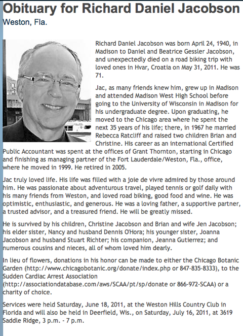Classmate Dick Anderson advised me today of the following obituary that appeared in the Madison