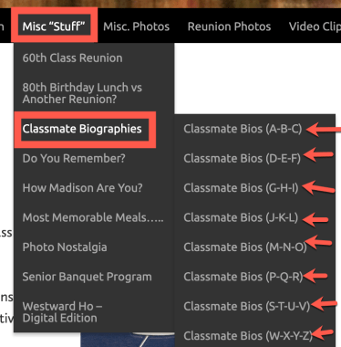 - The Classmate Biography Page has been split into several pages based on last names. When you highlight “Misc Stuff” on the Menu Bar, and then highlight “Classmate Biographies“, you will notice that there is now a choice of various separate pages to choose from, based on the classmate’s last name. See the screen shot below.